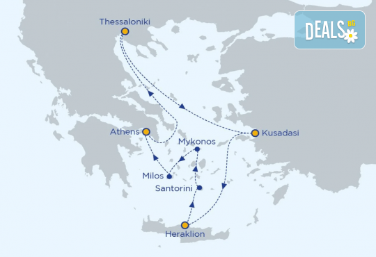 МАРШРУТ - Солун – Кушадасъ/Eфес– о. Крит - о. Санторини – о.Миконос – о.Милос – Пирея /Атина – Солун