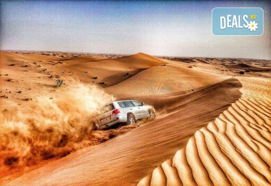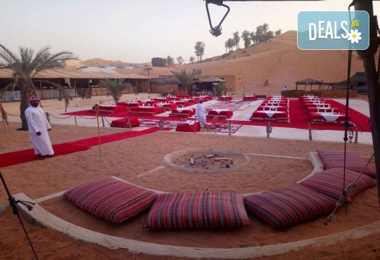 Това е незабравимо арабско приключение, което Ви отвежда далеч от шумния Дубай, сред златисти пясъчни дюни. Отпътуване с луксозни джипове 4х4 и достигате за около 30 мин. до пустинята. Тук започва истинско приключение сред дюните, невероятен смях и забавления. Фотопауза за снимане на залеза над дюните. Пристигате в бедуинско селище, където Ви очаква посрещане с арабско кафе и фурми и вечеря барбекю под открито небе. Тук можете да се облечете в традиционни арабски дрехи, да пояздите камили, да покарате сърф или ски по пясъчните склонове, да си направите временна татуировка с къна, да пушите наргиле. Преди да се завърнете в Рас Ал Хайма ще потанцувате местни танци на фона на арабска музика.