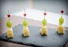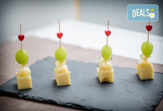 - • 1 плато с 30 бр. Коктейлни хапки със Синьо сирене и грозде върху пълнозърнесто хлебче.
