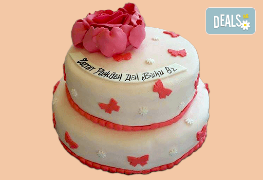 - Тортите, които са на два етажа могат да се изработят при минимален ваучер от 20 парчета или да се направят в по-малък вариант на един етаж, спрямо броя парчета в закупения от клиента ваучер