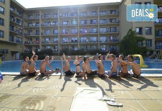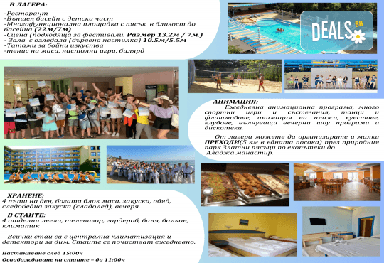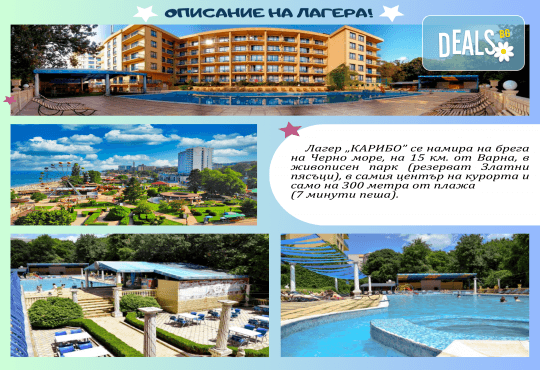 Лятна ваканция в детски лагер Карибо, Златни пясъци! Нощувка, закуска, обяд, следобедна закуска, вечеря, басейн, спортна площадка, анимация, сцена, от Аист Травел