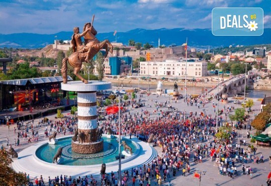 Програма: Отпътуване от София , от ЦЖПГ пред Билата в 06:00ч. Възможност за качване от Перник, Дупница и Кюстендил. Преминаване на граничните пунктове. Посещение на каньона на река Треска и язовир Матка - едно от най-впечатляващите места в Македония, заобиколено от стръмни и отвесни скали, сред които са скрити средновековни църкви и манастири. Там е разположен и манастира "Свети Андрей", чиито запазени фрески над западния вход на църквата разказват за историята на построяването му през 1389 г. от Андрей - вторият син на крал Вълкашин. Възможност за обяд и чашка ароматно кафе. Продължаваме за Скопие. Пешеходна разходка в града: Каменният мост - символ на града, старият квартал Вароша, Скопската чаршия, крепостта Скопско кале, църквата "Св. Спас" със саркофага на Гоце Делчев, "Свети Климент" - най - големият православен храм в Скопие, новият площад Македония с паметниците на Александър и Филип Македонски, Юстиниан, цар Самуил, Св. Св. Кирил и Методий, Гоце Делчев, Св. Климент Охридски, Порта Македония и др. Свободно време за обяд и разходка. Отпътуване за България. Пристигане в София вечерта.