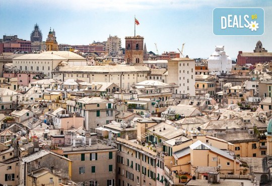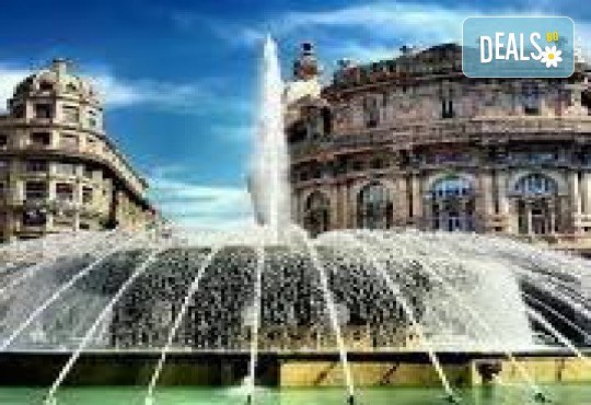 5 ден: Закуска. Отпътуване за Генуа. Разходка в Генуа - площада Ферари (Piazza De Ferrari), на който се намират операта teatro Carlo Felice, катедралата Сан Лоренцо, старото пристанище (Porto Antico), с възможност за наблюдение на древния фар (Torre della Lanterna - най-старата подобна структура в света, върху нея е изрисуван символа на Генуа) и огромния аквариум. Отпътуване за езерото Гарда. Свободно време в Сирмионе - средновековен град крепост, построен на едноименния полуостров на езерото Гарда. Свободно време. Нощувка в района на Верона.