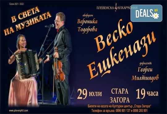 - • Концерт на Веско Пантелеев-Ешкенази, Вероника Тодорова и Плевенската филхармония с диригент маестро Георги Милтиядов ще представят музика от Астор Пиацола, Енио Мориконе, Джон Уилямс, Петко Стайнов, Michael Jackson, Queen и др. в Културен център "Стара Загора", Стара Загора