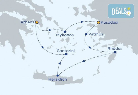 Маршрут: Лаврион /Атина – о. Миконос – Кушадасъ/Eфес – о. Патмос – о. Родос - о. Крит - о. Санторини – Лаврион /Атина