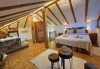 - Мансардно спално помещение с дизайнерска спалня и нощни шкафчета от дърво;