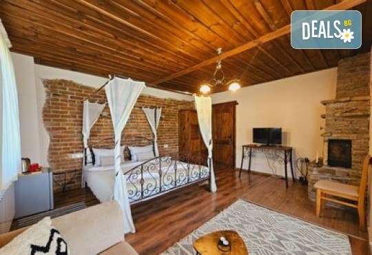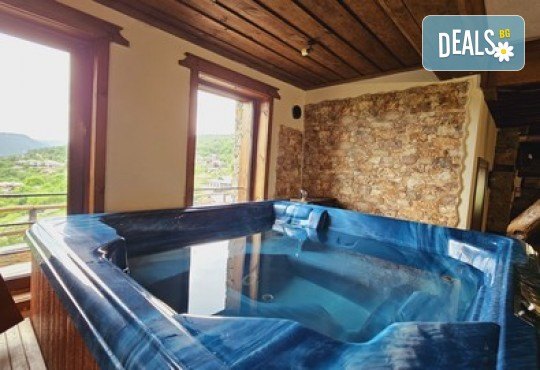 Стая Делукс, освен стандартното обзавеждане, предлага спалня тип балдахини, камина, заредена с дърва и хидромасажна вана във формата на сърце пред панорамен прозорец с гледка към с. Лещен.