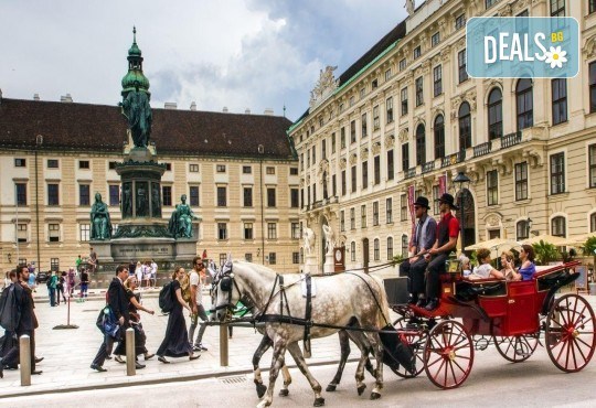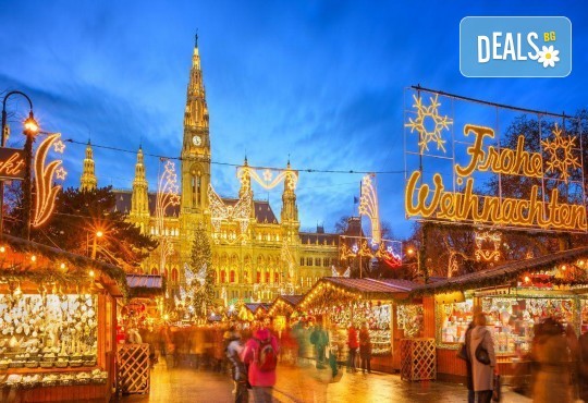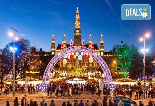 Панорамна обиколка на Виена (включена в цената) - дворецът "Белведере", един от най-хубавите барокови образци в света, принадлежал на Хабсбургите; Виенската опера, където ежегодно се провежда оперен бал; булевард "Рингщрасе", изграден на мястото на старата крепостна стена;дворецът "Хофбург" - зимната резиденция на Хабсбургите, Парламентът със статуята на Атина Палада, Кметството - внушителна сграда в неоготически стил,пред което се издига най-големият Коледен базар, Къщата на Хундертвасер с необичайните си цветни етажи, следващи единствено природните форми, най-старият увеселителен парк в Европа "Пратер" със символа на Виена - Виенското колело. Свободно време. Нощувка.