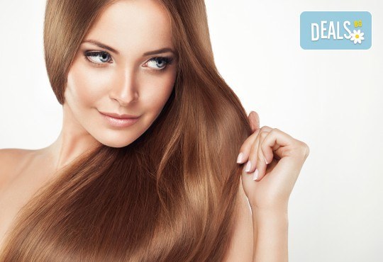 Боядисване с боя на клиента, кератинова терапия и прическа в Студио Хармония-17%