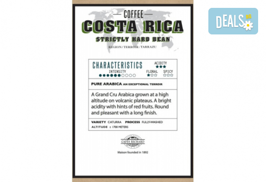 Кафе Коста Рика е елегантно кафе с ярка киселинност с нотки на червени плодове с дълъг послевкус. Отлично кафе за еспресо или бавно кафе, за да съблазни най-претенциозните любители.