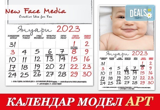 12 листов Календар с 12 Ваши снимки модел АРТ за 2026 г. от New Face Media