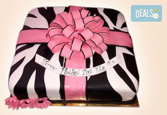 - Тората с декорация "подарък" може да бъде изработена над 20 парчета, поради оформянето на подаръка като 2-ри етаж. Всички торти, които имат оформен втори етаж могат да бъдат направени минимум от 20 парчета, изключение правят кръглите модели с малка декорация като втори етаж, които могат да бъдат изработени и във вариант 12 парчета