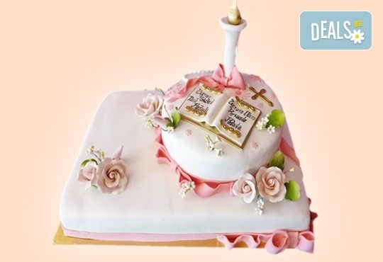За кръщене! Красива тортa за Кръщенe с надпис "Честито свето кръщене", кръстче, Библия и свещ от Сладкарница Джорджо Джани
