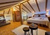 - Мансардно спално помещение с дизайнерска спалня и нощни шкафчета от дърво;