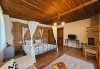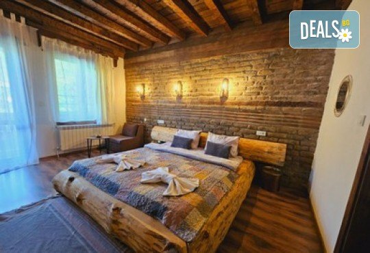 Стая Делукс, освен стандартното обзавеждане, предлага спалня тип балдахини, камина, заредена с дърва и хидромасажна вана във формата на сърце пред панорамен прозорец с гледка към с. Лещен.